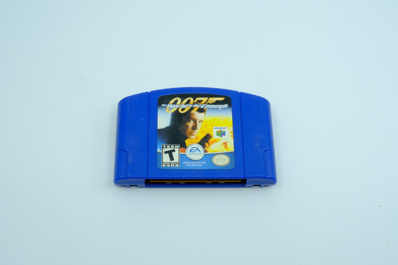 Visible Markings: Blue cartridge shell; front label shows 007 The World Is Not Enough artwork with Pierce Brosnan; ESRB “T” rating; EA Games and Nintendo logos; Nintendo Seal of Quality.