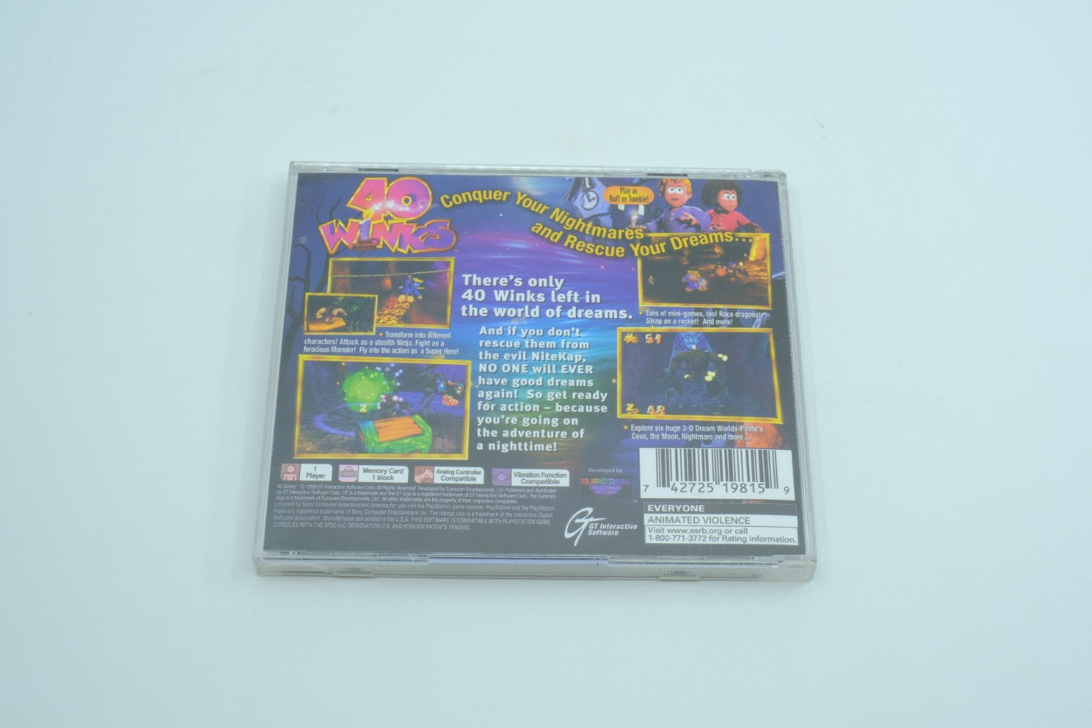 Sony PlayStation PS1 jewel case; ESRB Everyone; NTSC U/C; SLUS-00874; GT Interactive Software; Compact Disc logo