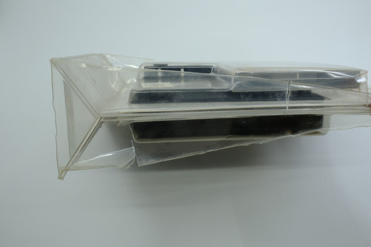 Clear plastic clamshell packaging shows heavy wear with creasing, scuffs, and bent/warped edges; visible yellowing/dirtying near top hang tab area; contents inside appear intact through plastic