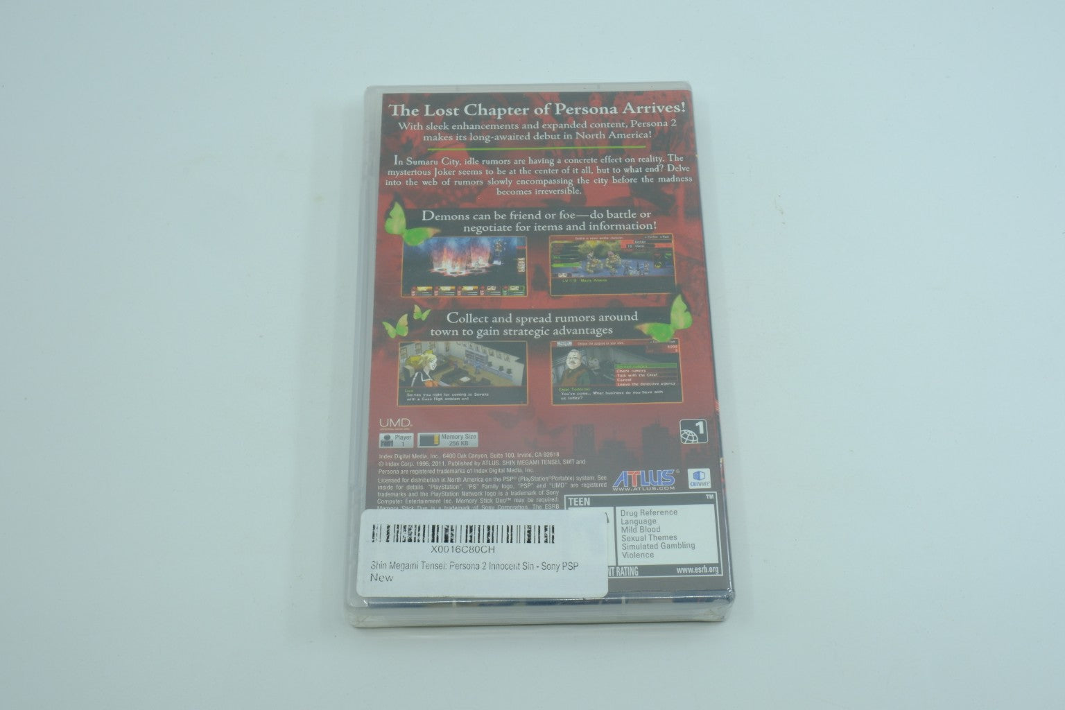 PSP Only On PlayStation banner; UMD; ESRB Teen; Atlus logo; sticker label on back