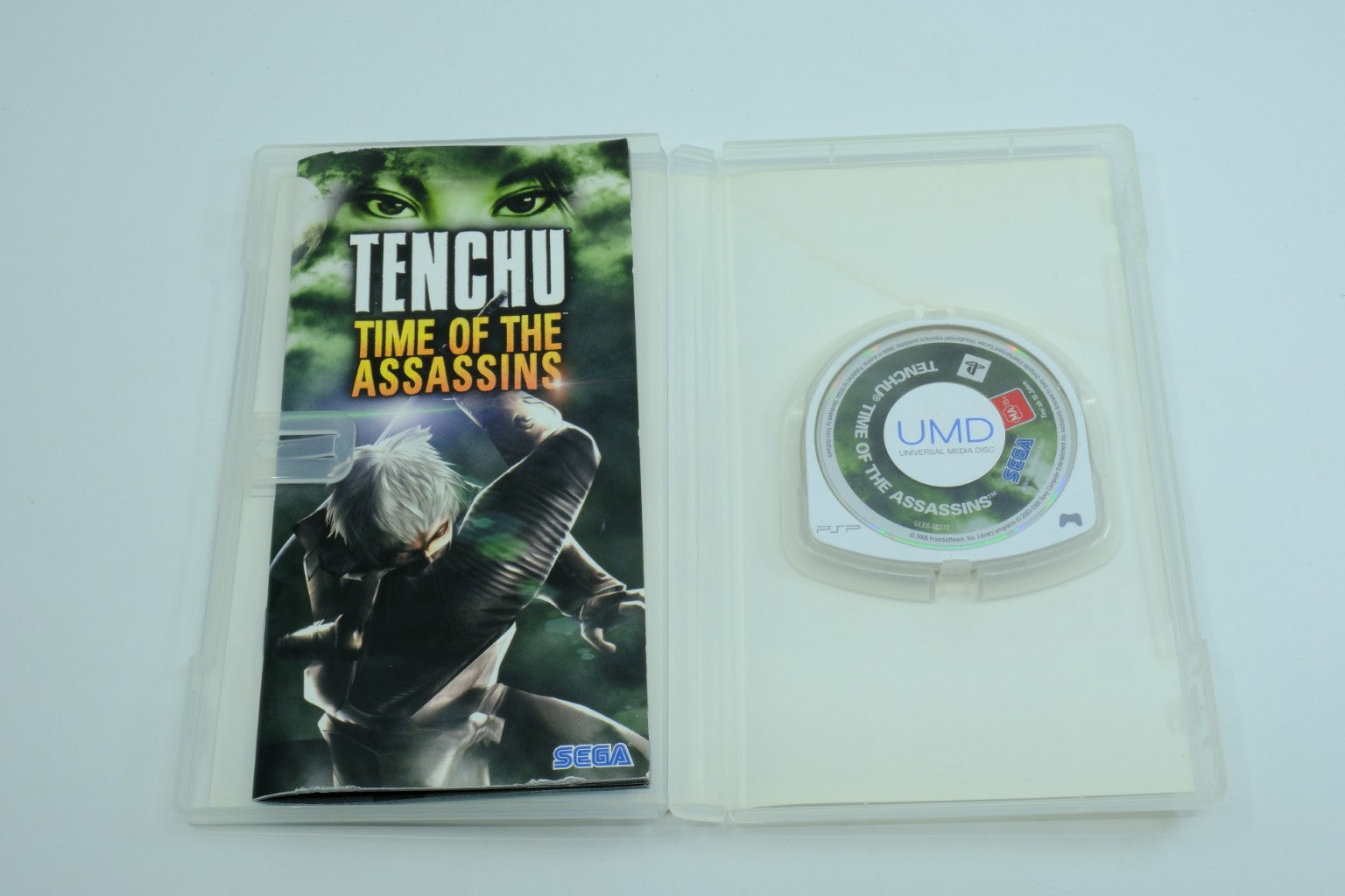 Clear PSP case shows light scuffs; cover art appears clean with no visible tears; manual/booklet visible inside case; UMD label appears clean